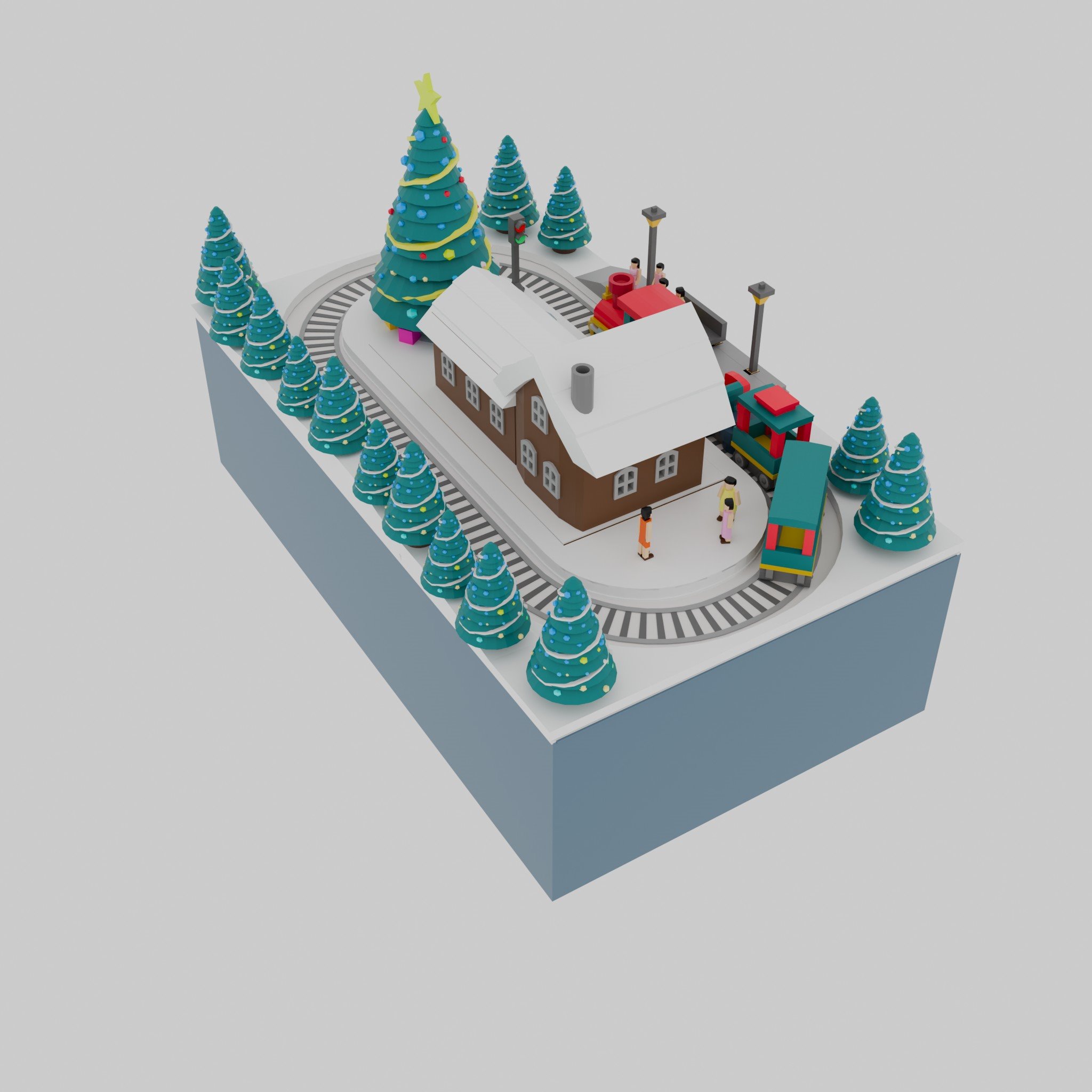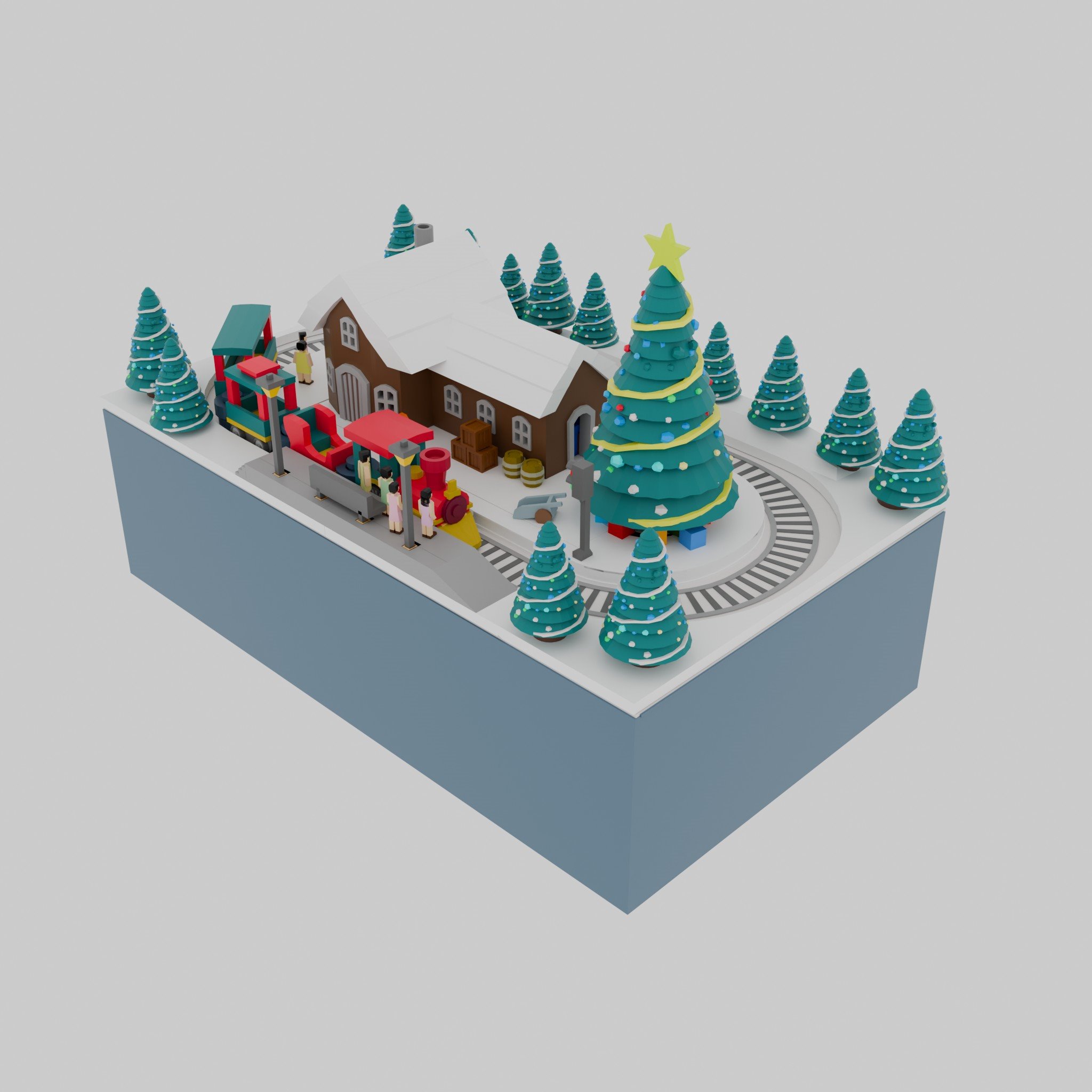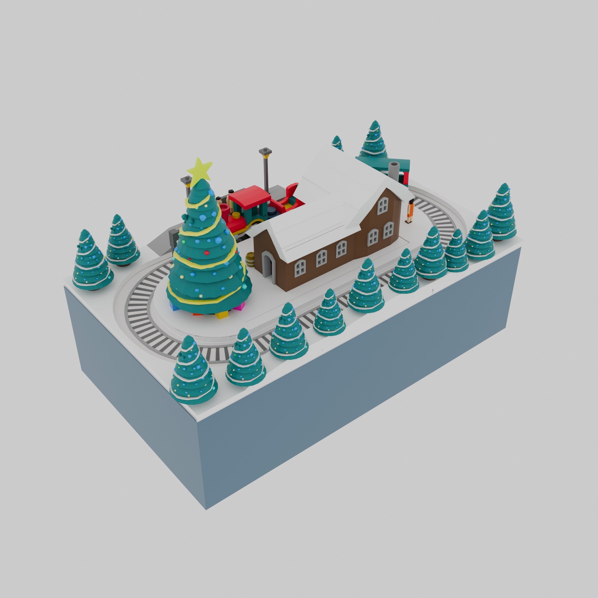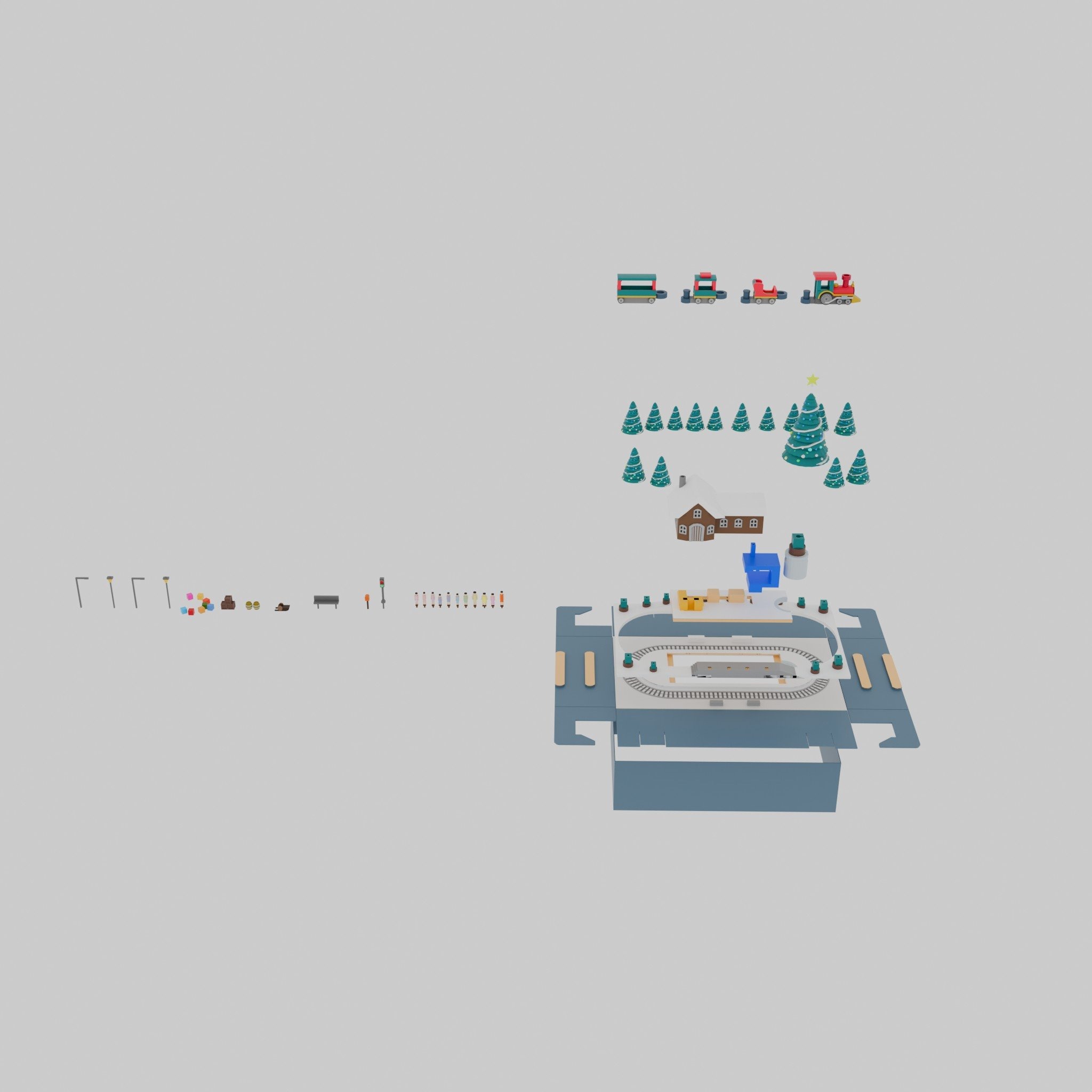 This pack has 1 house, 1 big Christmas tree, and 4 cabin trains.