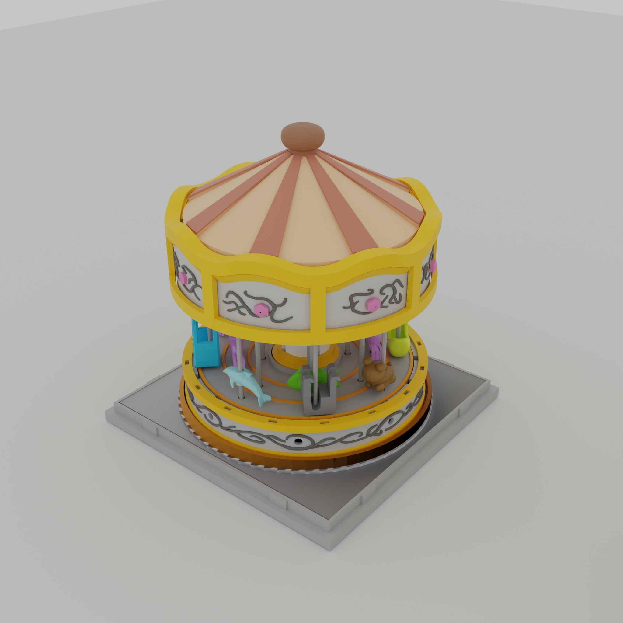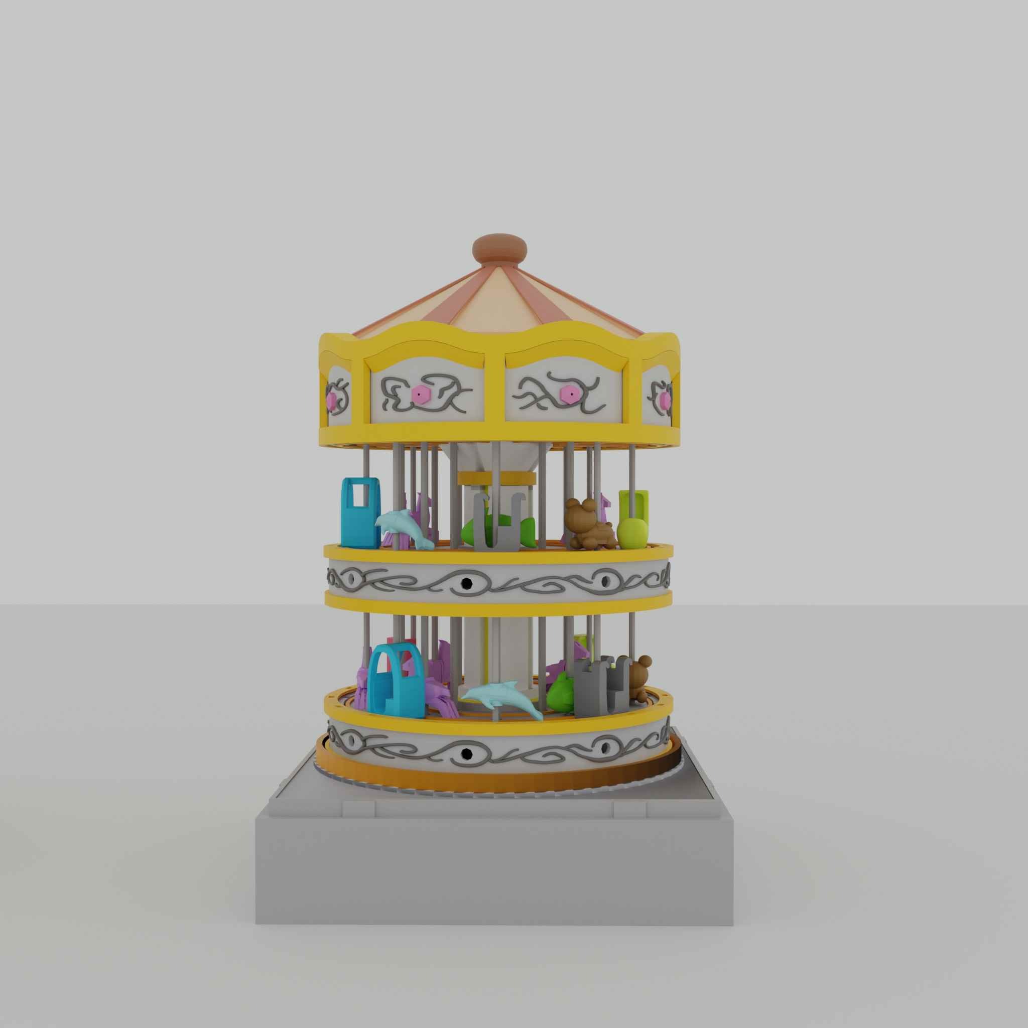 The carousel has two floors with small, high-detail objects such as a horse, dolphin, bear, and fish, which can rotate and move up and down automatically.