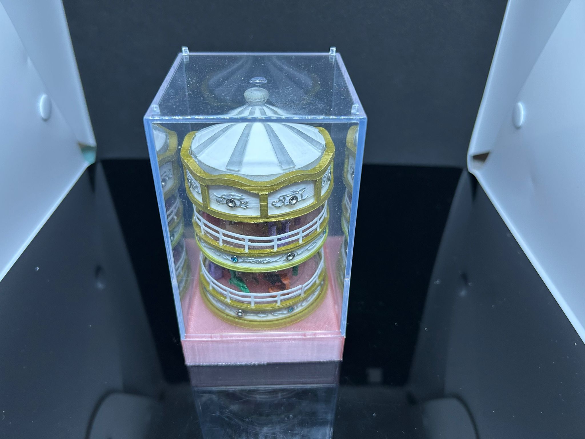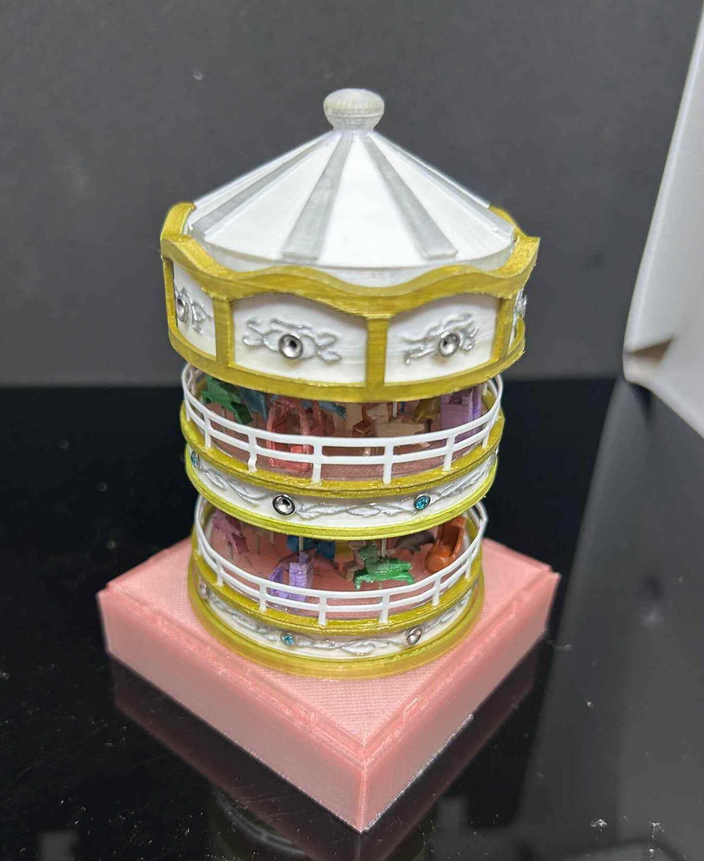 Designing this carousel took me a long time. The challenge was getting the horse and dolphin to move up and down while spinning. Also, I had to consider the light transmission of the LED lights in the middle layer, so it took quite a while. Finally, I added the gemstone beads, and the result was quite nice!
