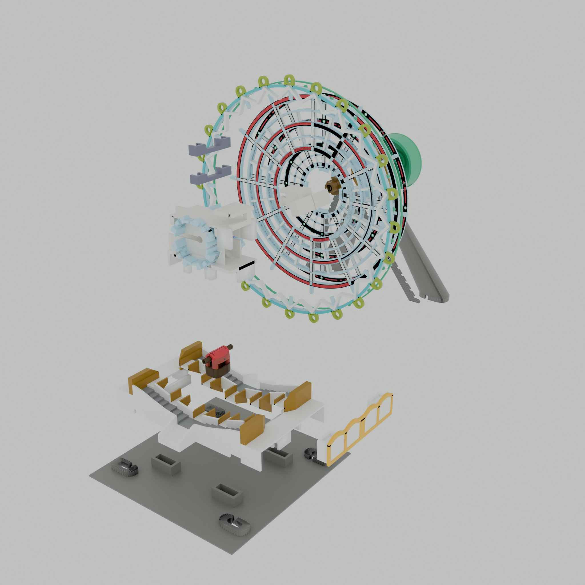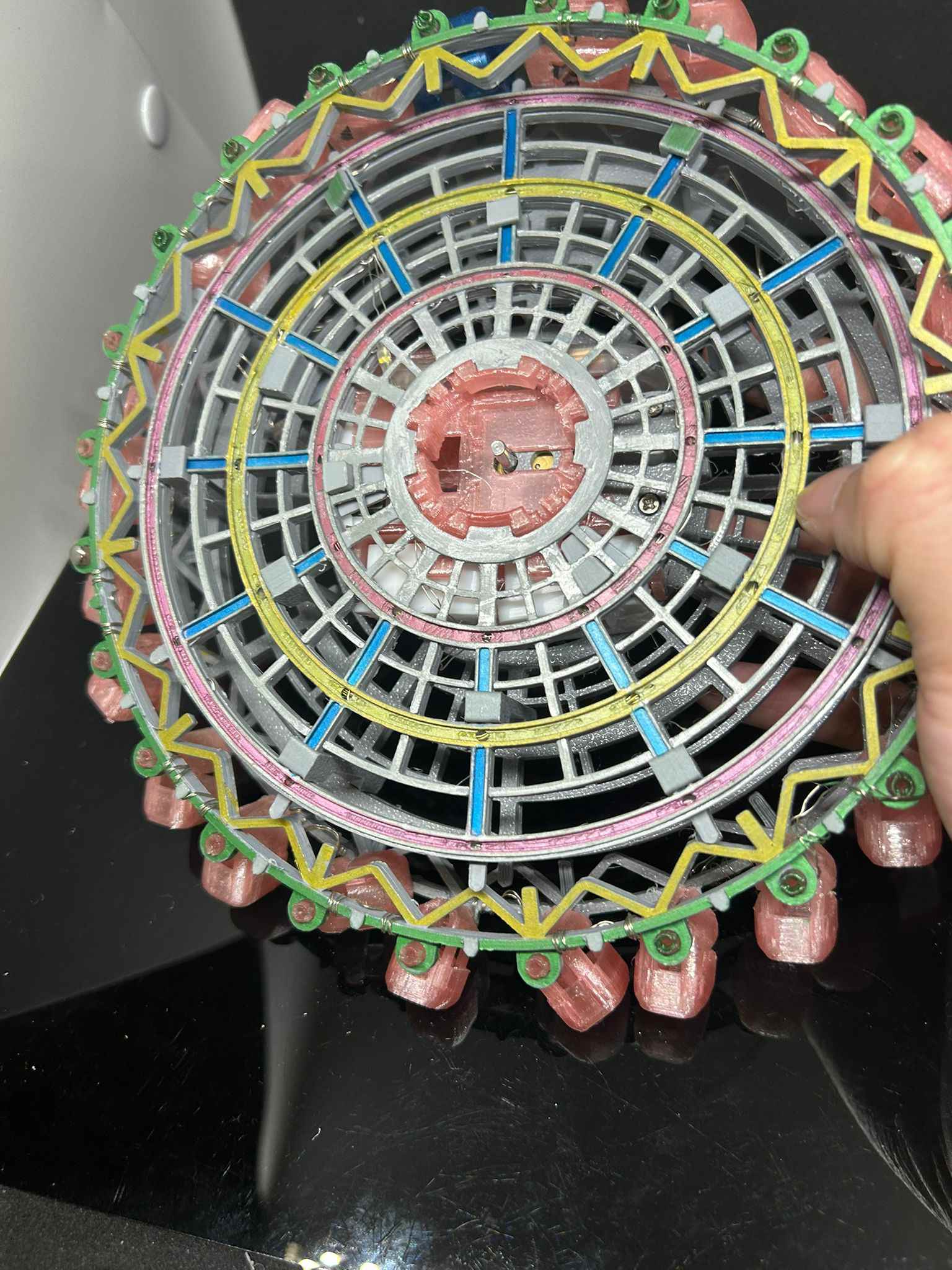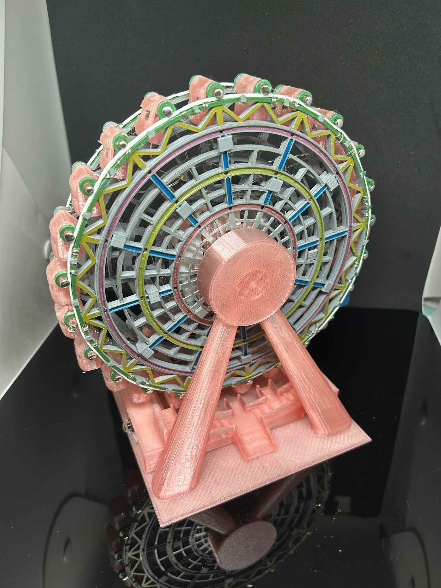 The challenge in designing this Ferris wheel was hiding the LED lines in the center, so the columns were much thicker. Furthermore, the N20 motors were too large, making it impossible to scale down the entire model. Finally, considering the audience boxes would fall down and also have LED lights, this took quite a while.我設計這摩天輪既難處係中間位要藏LED線,所以柱位比例上會粗左好多。而且N20摩打體積太大,我無法將成個模型縮細。最後考慮到觀眾包廂要墮下同有LED燈,令我用左不少時間。