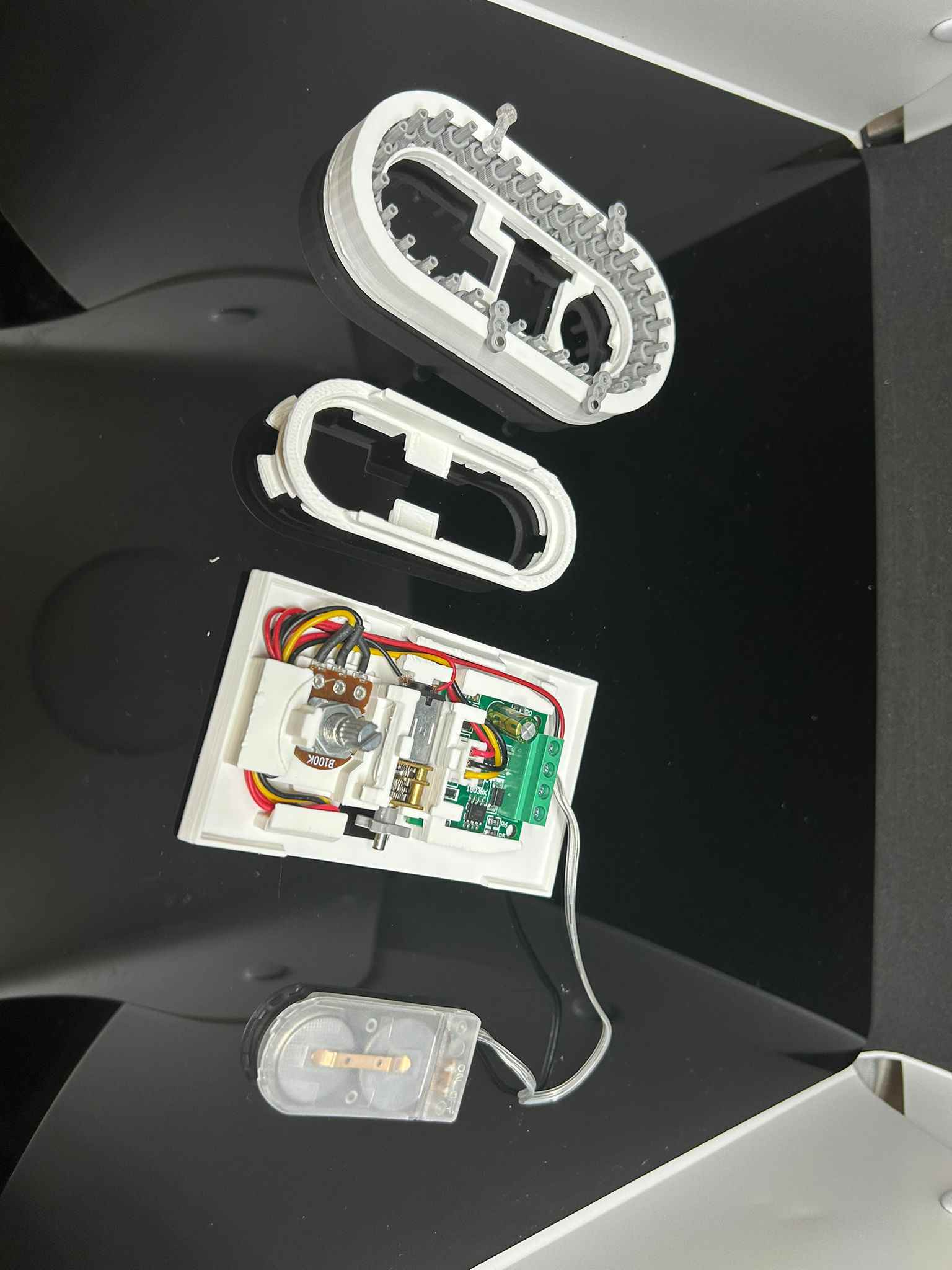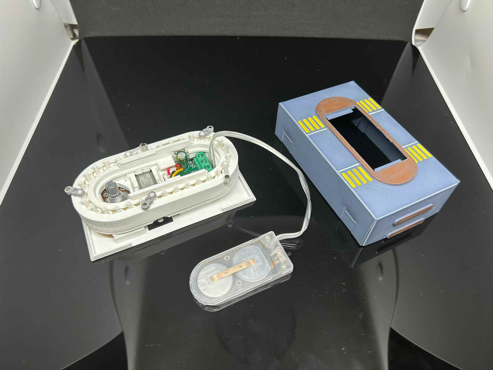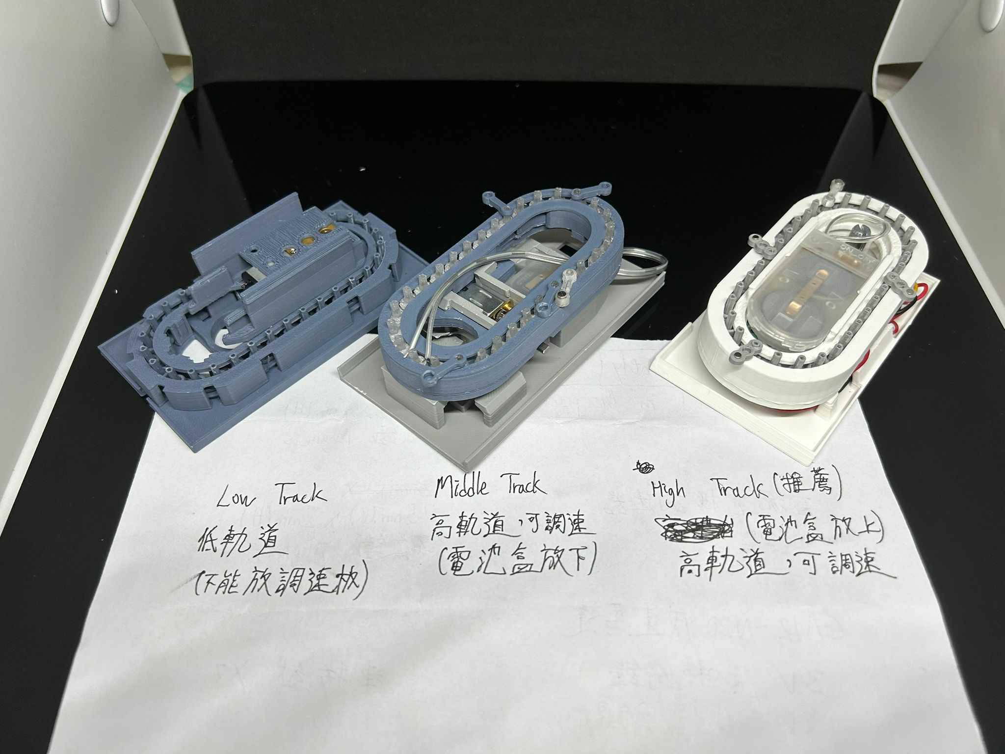 This model took me a lot of time because I wanted to fit it in a glasses case, and I wanted the track and motor to be separate, so I designed three versions. The center connector was very easy to break, so I eventually improved it. Fitting the speed controller, battery box, and motor in such a limited space was a real challenge, so I printed it about ten times before I finally finished it.這模型用左我特別多時間,因為我想將模型放入眼鏡盒內,而且我要軌道同摩打分開,所以我前前後後設計左三個版本。中間接駁位好易斷,但我最後都改善左。在有限空間內放置調速器,電池盒同摩打,好高難度,所以我打印左十次後才推出。